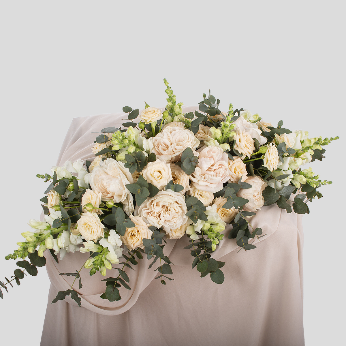 Состав композиции: роза, маттиола, антиринум, эвкалипт Диамтер композиции: ~ 45 см