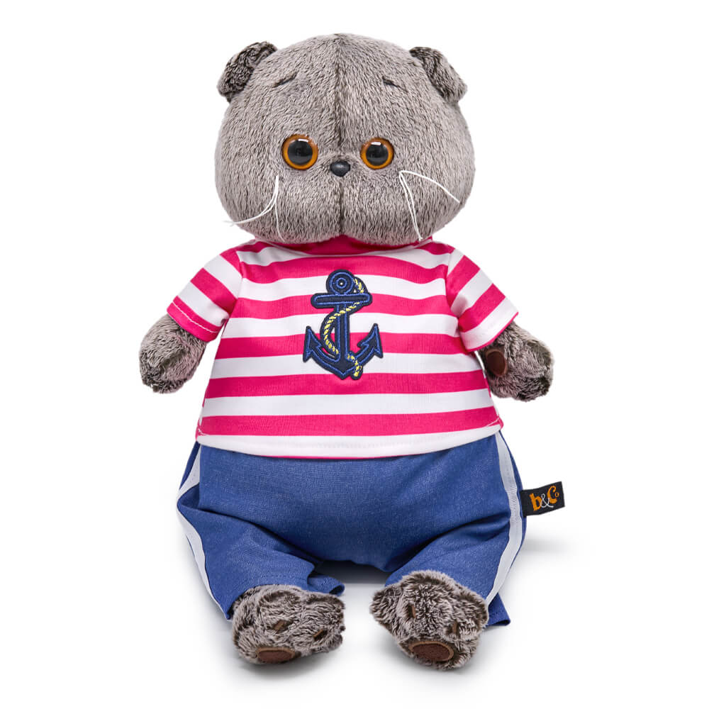 Кот Басик в трикотажной футболке в розово‑белую полоску с нашивкой спереди в виде якоря. Также на Басике модные синие штаны с белыми лампасами.