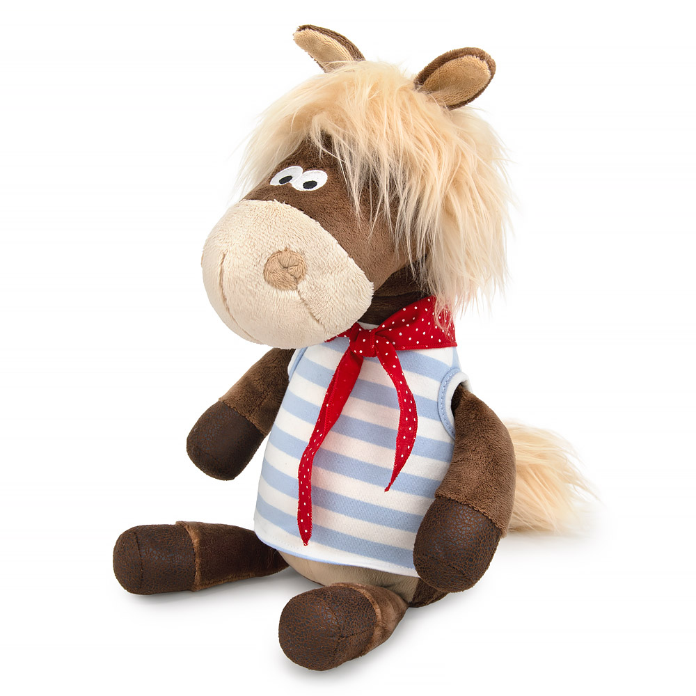 Красавчик Джонджо в майке-тельняшке в бело-голубую полоску, с алым в горошек платочком на шее. Конь Джонджо сшит из софта цвета молочного шоколада, животик из кремового, а мордочка из молочного. Копыта из коричневой экокожи. Грива и хвост из длинного меха цвета сливочного крема. Глазки вышиты.