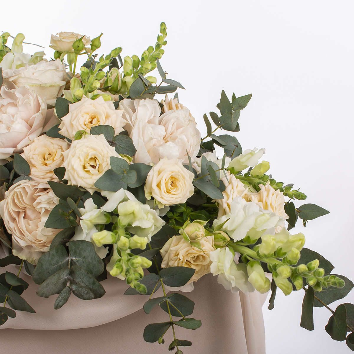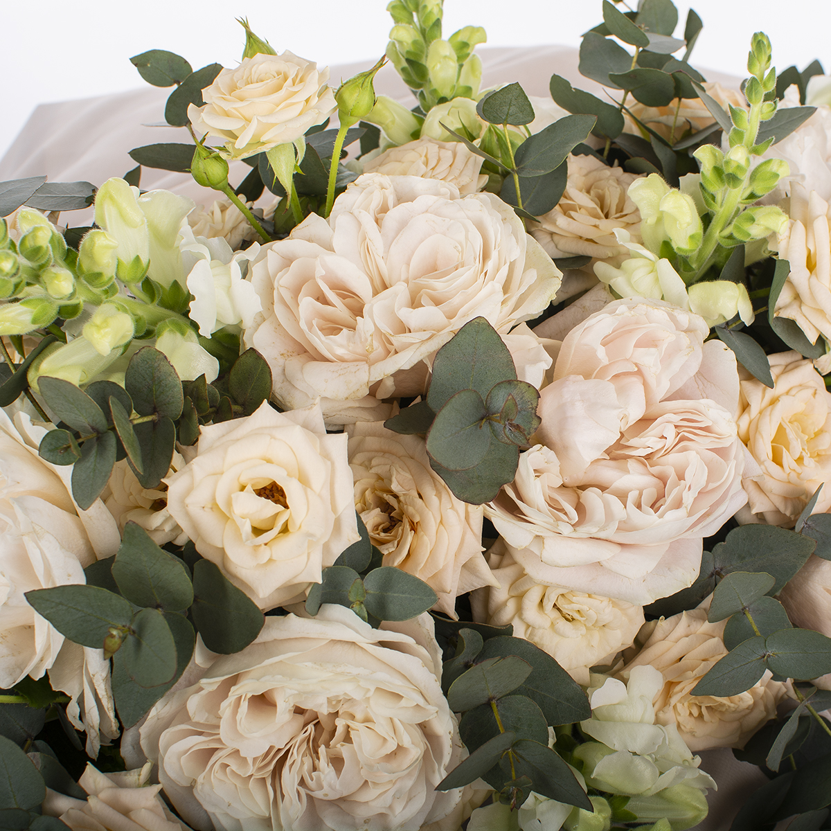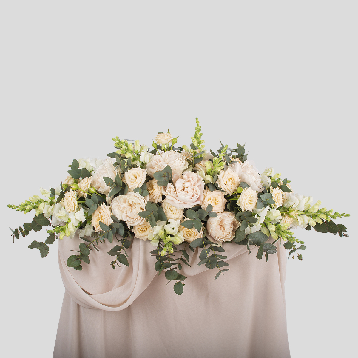 Состав композиции: роза, маттиола, антиринум, эвкалипт Диамтер композиции: ~ 45 см