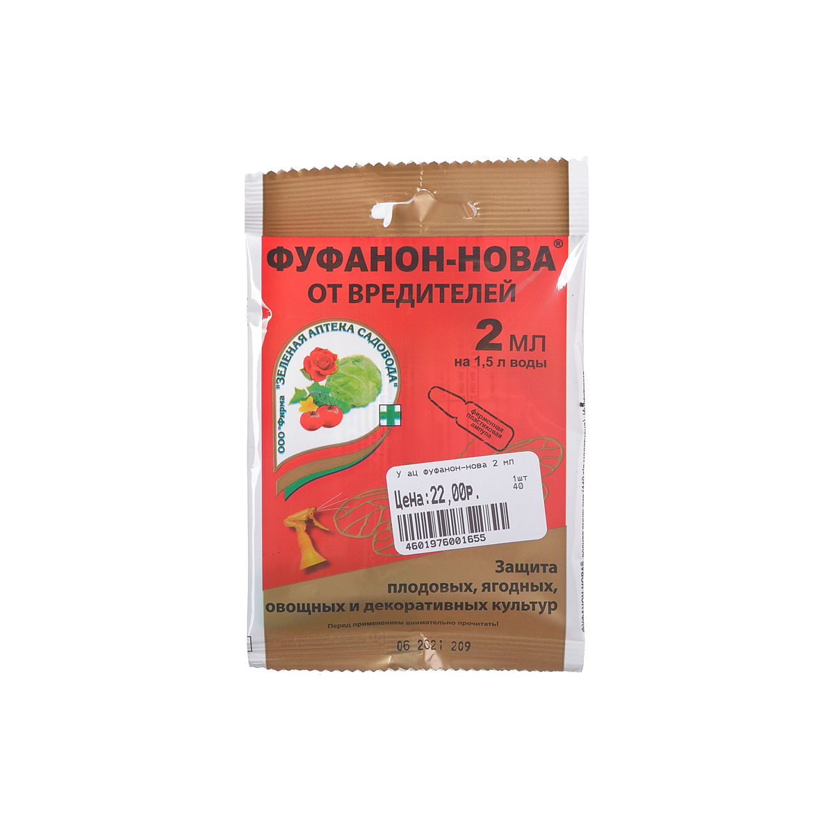 Инсектицид, применяется для борьбы с вредителями плодовых, ягодных, овощных и декоративных культур. В упаковке 1 ампула по 2мл, расчитана на 1,5л воды. Защита растений не менее 7 дней. Не фитотоксичен, культуры устойчивы к препарату. Неселективен.
